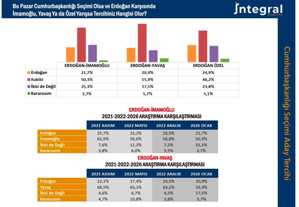 İntegral Araştırma son 4 yıl boyunca yaptığı araştırmalarla karşılaştırıldığında Erdoğan ile CHP’nin olası adayları senaryoları için en kritik bulgunun “İkisi de değil, Kararsızım” seçeneklerindeki artış olduğunu açıkladı. Bu artışın hem iktidar hem muhalefet cephesindeki yorgunluk kadar seçmenin yeni yol, yeni aday arayışı ve de özellikle İstanbul merkezli yürütülen soruşturmalarla açıklanabileceği vurgulandı.