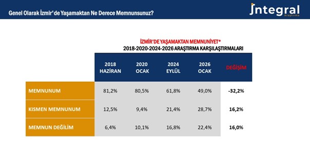İntegral Araştırma’nın verilerine göre “İzmir’de yaşamaktan memnun musunuz?” sorusuna memnunum diyenlerin oranı 2018 araştırmasında %81’i geçiyorken 2026 Ocak’ta %49’a geriledi. İntegral Araştırma, “Kısmen memnunum ve Memnun değilim” yanıtlarındaki aşırı artışı “Sosyolojik bir deprem” olarak tanımladı. Yapılan açıklamada; İzmir’de yaşam memnuniyetindeki düşüşün ülkenin içinde bulunduğu sosyo-ekonomik-siyasal gidişatın yanı sıra yerel yönetimlerin sorumluluk alanındaki temel kentsel hizmetlere erişimdeki sıkıntılarla açıklamanın mümkün olduğu vurgulandı.