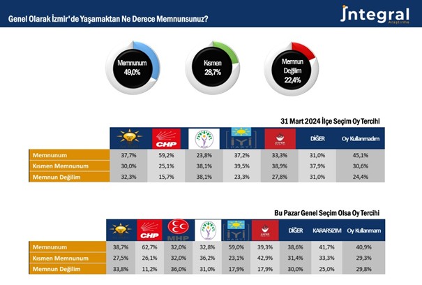 İntegral Araştırma tarafından yapılan açıklamada şu görüşlere yer verildi: İzmir, yerel yönetim performansı ile toplumsal beklenti arasındaki makasın tehlikeli biçimde açıldığı bir "Eşik noktasına" doğru ilerlemektedir. Özellikle 2018’den bu yana yaşam memnuniyetinde gözlenen 32 puanlık radikal düşüş, kentin kronikleşen çöp, yol ve altyapı gibi temel belediye hizmetlerindeki yetersizliklerle birleştiğinde, İzmirlilik kimliğinin taşıyıcı kolonu olan "Konforlu yaşam" algısının ciddi bir erozyona uğradığını göstermektedir. Şehrin en önemli sorunlarının %84 oranında yerel yönetim odaklı olması ve "Sorun yok" diyenlerin oranının %4,7 gibi marjinal bir seviyeye gerilemesi, önümüzdeki dönemde seçmen davranışında ideolojik bağlılıktan ziyade "Hizmet odaklı bir kopuş" yaşanma ihtimalini güçlendirmektedir.